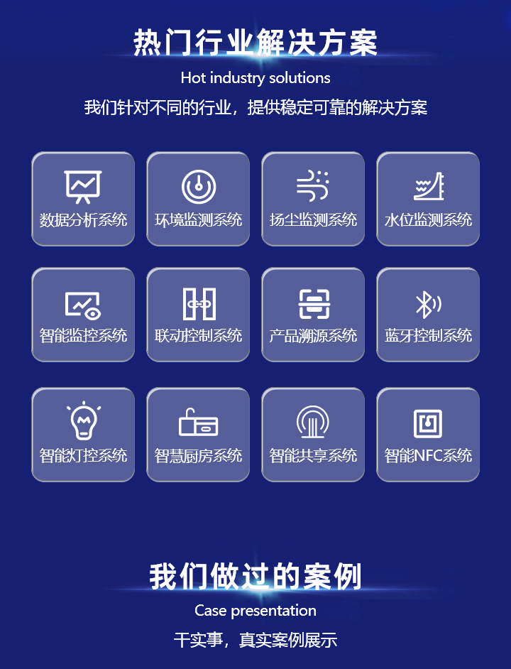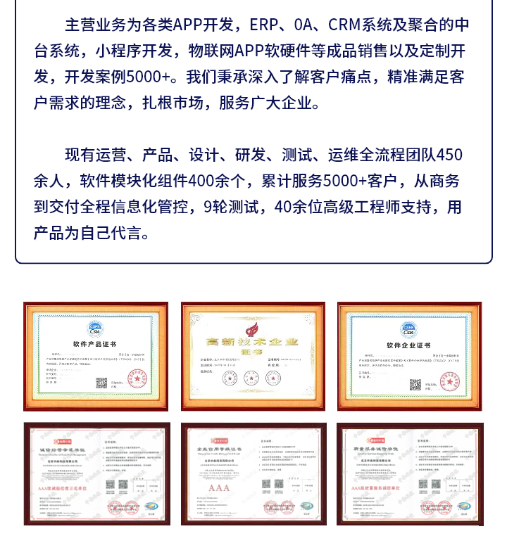 电商营销系统、ERP、OA、CRM系统及聚合的中台系统、在线教育系统,物联网自动化产品等成品销售以及定制化开发